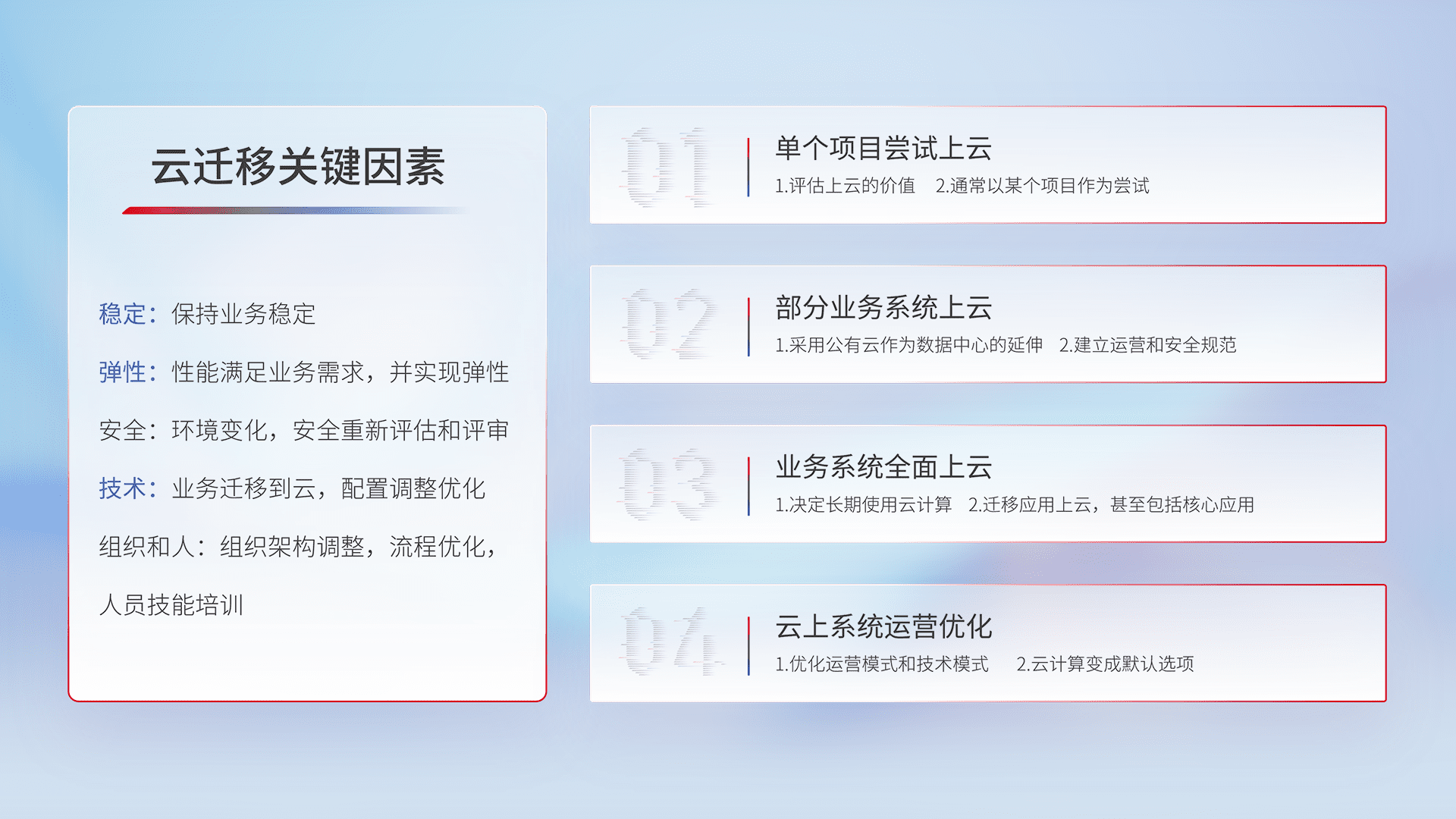 结合实际业务,,从规划设计、、云平台选型、、云原生改造、、数据迁移、、集成交付,,,,迁移全过程为客户识别最佳上云路径,,做好风险识别管理,,,设计网络架构、、身份权限、、安全审计合规、、、、操作审计、、、、日志审计、、、、监控告警策略、、、、多站点容灾设计等,,,对云上基础设施进行整体规划,,,,提升IT治理水平,,以满足弹性、、、、高可用、、、、高性能的需求。。