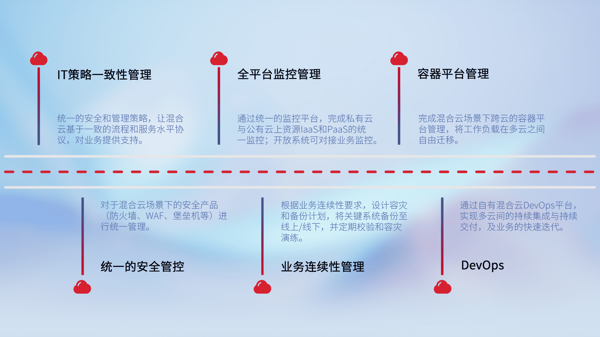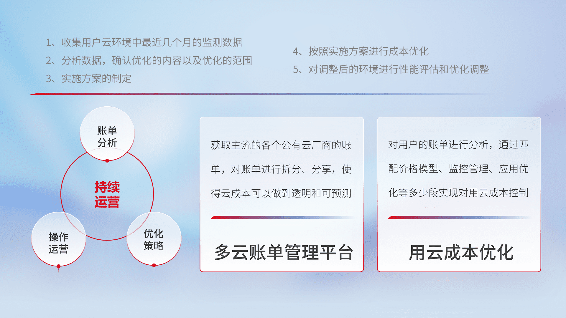 通过多云纳管,,,,以统一的资源数据模型把客户的云资源进行抽象和封装,,进而实现对多云资源的统一操作,,,,保障云资源管理的可靠性、、、、稳定性与可用性。。量身定制化运维内容,,,,配置、、开发运维、、、补丁管理、、、、备份、、、监控、、、、认证和访问管理、、审计和日常巡检等,,,保障在用云过程中的可靠度,,稳定度以及高可用率。。。